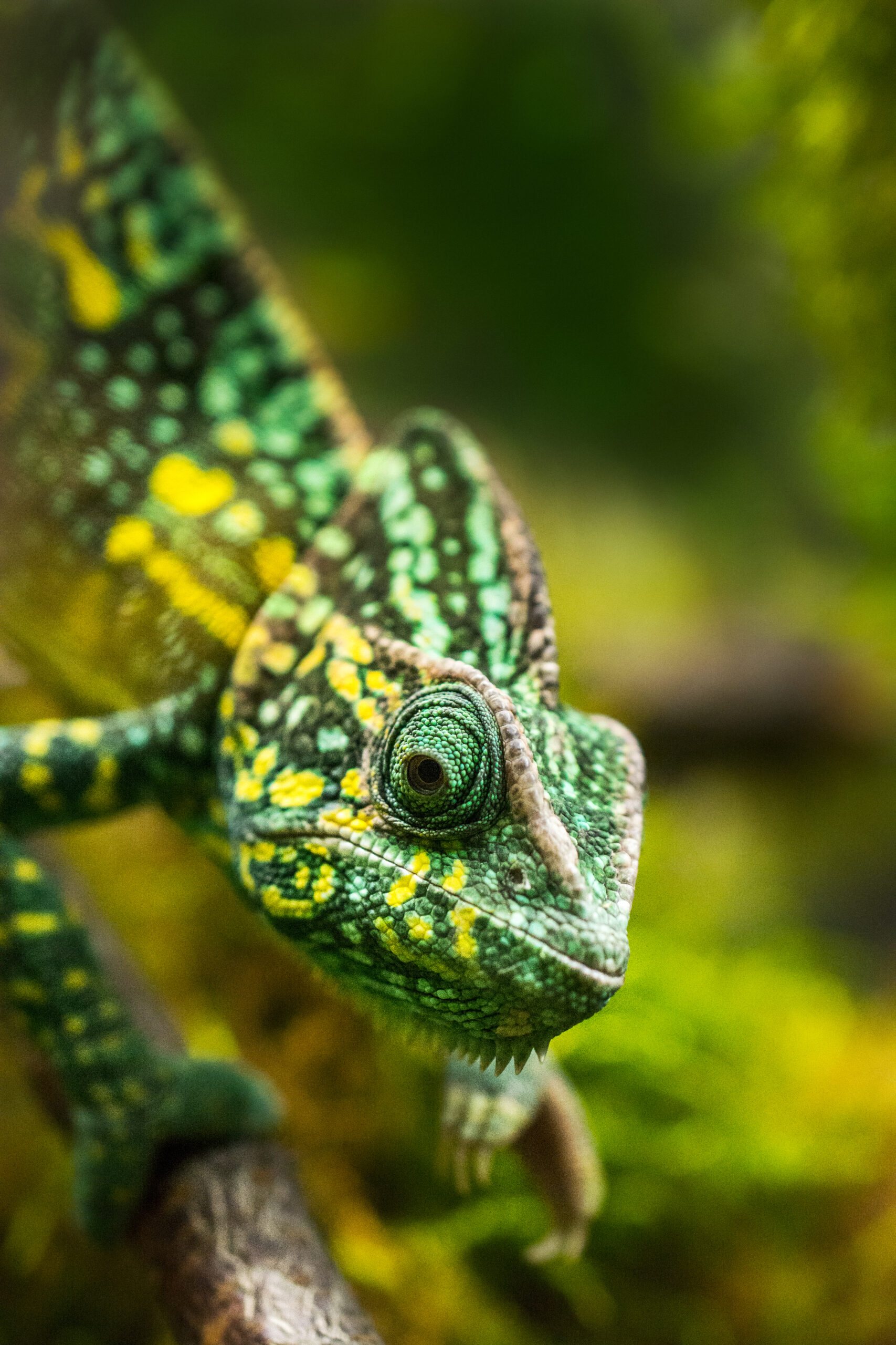 Close-up van de kop van een groene kameleon met opvallend oog en schubben op een wazige achtergrond.