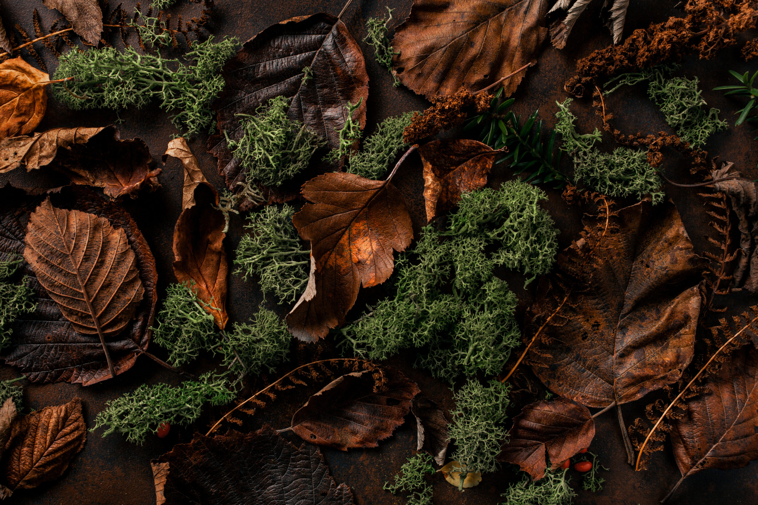 Bovenaanzicht van een herfsttextuur met bruine bladeren en plukjes groen mos op een donker oppervlak.