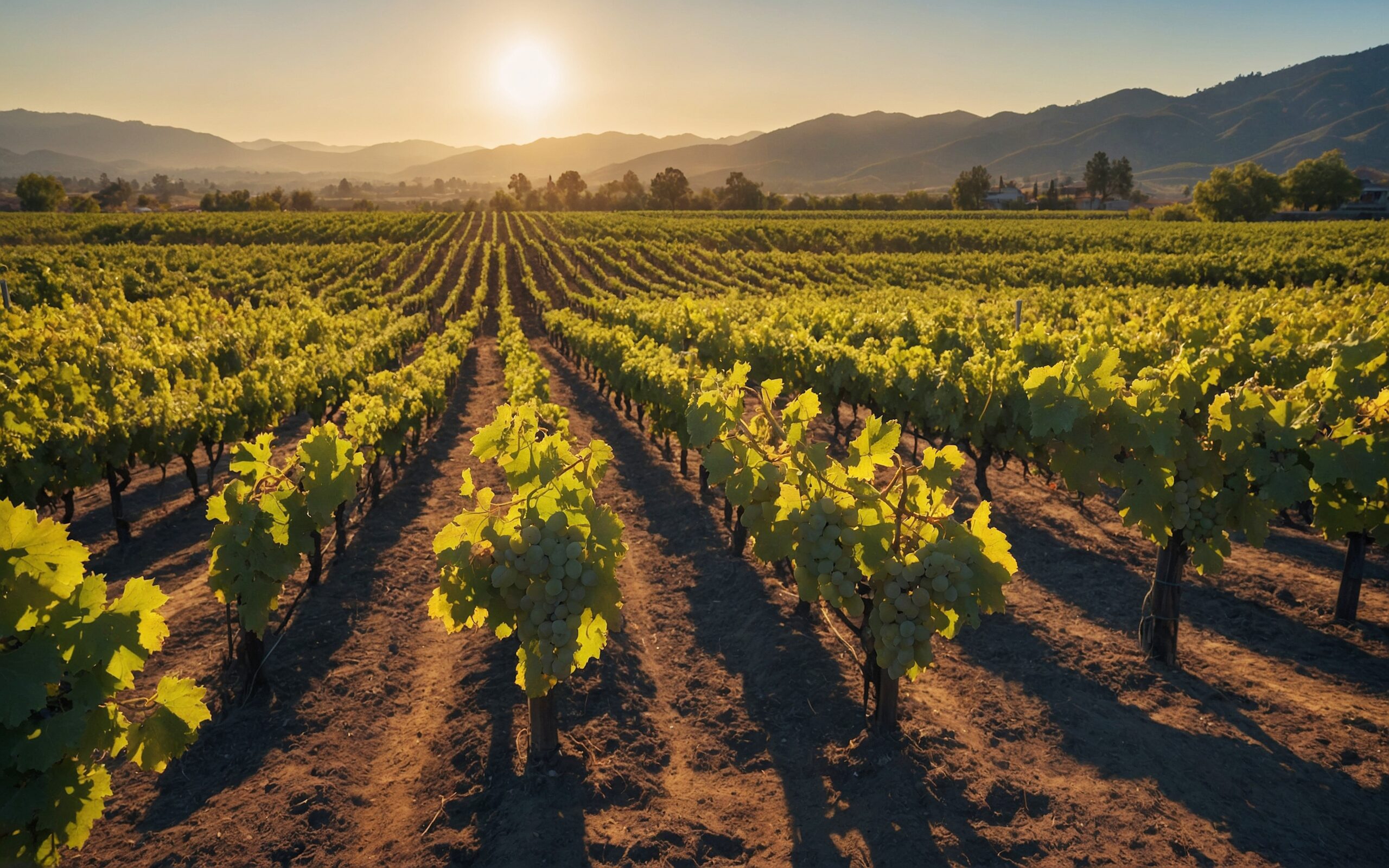 Zonnig landschap van een wijngaard met symmetrische rijen wijnstokken die naar de horizon leiden onder een gouden zonsondergang.